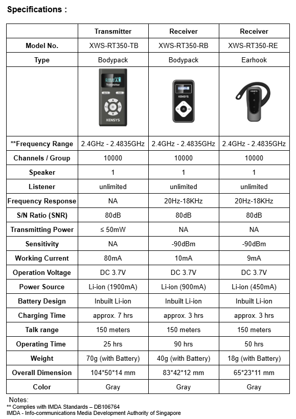 > Global Licence-Free System: 2.4GHz - 2.4835GHz > One Transmitter can work with both Bodypack or Earhook Receiver > Bodypack Receiver come with 3.5mm Universal Earphone jack > Change Channel wirelessly in bulk with One Touch Pair > One Touch Mute or Power-off All Receivers > Timed shutdown to conserve battery > Anti-interference Circuit - Auto avoid interference > In-Built with Li-ion Battery > Transmitter comes with AUX 3.5mm jack for playback via any devices > Long Battery Life > Transmitter 25 hours > Long Battery Life > Receiver Earhook: 50 hours, Receiver Bodypack: 90 hours > 150m High Clarity Voice Transmission > 10000 IDs/Channels allow 10000 Groups to use simultaneously. > Complies with IMDA Standards – DB106764 *IMDA - Info-communications Media Development Authority of Singapore Application :